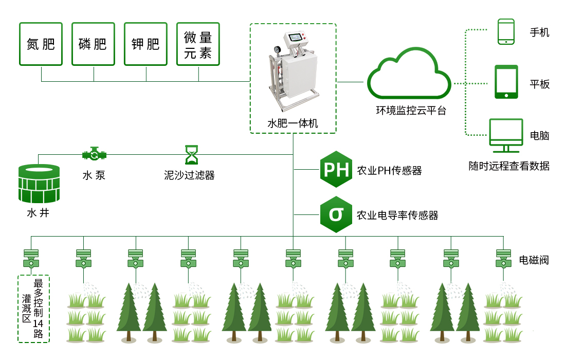 智能水肥一體化系統(tǒng):與傳統(tǒng)的灌溉方法相比,仁科水肥一體化智能灌溉系統(tǒng)采用傳感器、物聯(lián)網(wǎng)、云計算等多項技術(shù),集灌溉和施肥于一體,由水肥一體機、土壤墑情采集終端(土壤溫度水分電導率三合一變送器、土壤氮磷鉀變送器、土壤PH變送器)、過濾系統(tǒng)、閥門控制器、電磁閥、田間管路、監(jiān)控軟件云平臺組成,具有節(jié)水節(jié)肥、節(jié)省人力的特點。