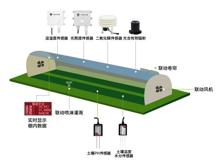 由多要素土壤傳感器和百葉盒傳感器RS-BYH-M組成,其中土壤變送器能夠?qū)ν寥赖臏囟?、含水量、電?dǎo)率、PH值、氮、磷、鉀等因素進(jìn)行實時監(jiān)測;其中的百葉盒傳感器內(nèi)置溫濕度、二氧化碳、光照等傳感器,能夠?qū)崟r監(jiān)測大棚內(nèi)的空氣溫濕度、二氧化碳濃度和光照強度等氣象因素,然后通過GPRS/4G的方式將數(shù)據(jù)上傳至云平臺。