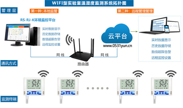 實(shí)驗(yàn)室溫濕度監(jiān)測系統(tǒng)由監(jiān)測終端、通訊方式、應(yīng)用層組成。WIFI型多探頭溫濕度記錄儀是系統(tǒng)的監(jiān)測終端,采用一機(jī)多點(diǎn)的布置方式,也可以多機(jī)多點(diǎn)監(jiān)測的布置方式,可實(shí)現(xiàn)24小時(shí)不間斷在線監(jiān)控,數(shù)據(jù)異常后現(xiàn)場聲光報(bào)警,短信報(bào)警,APP報(bào)警,郵箱報(bào)警等功能。
