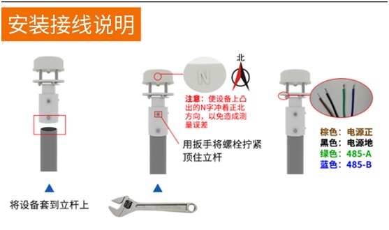 超聲波風(fēng)速風(fēng)向傳感器安裝也比較簡單方便。如下圖: